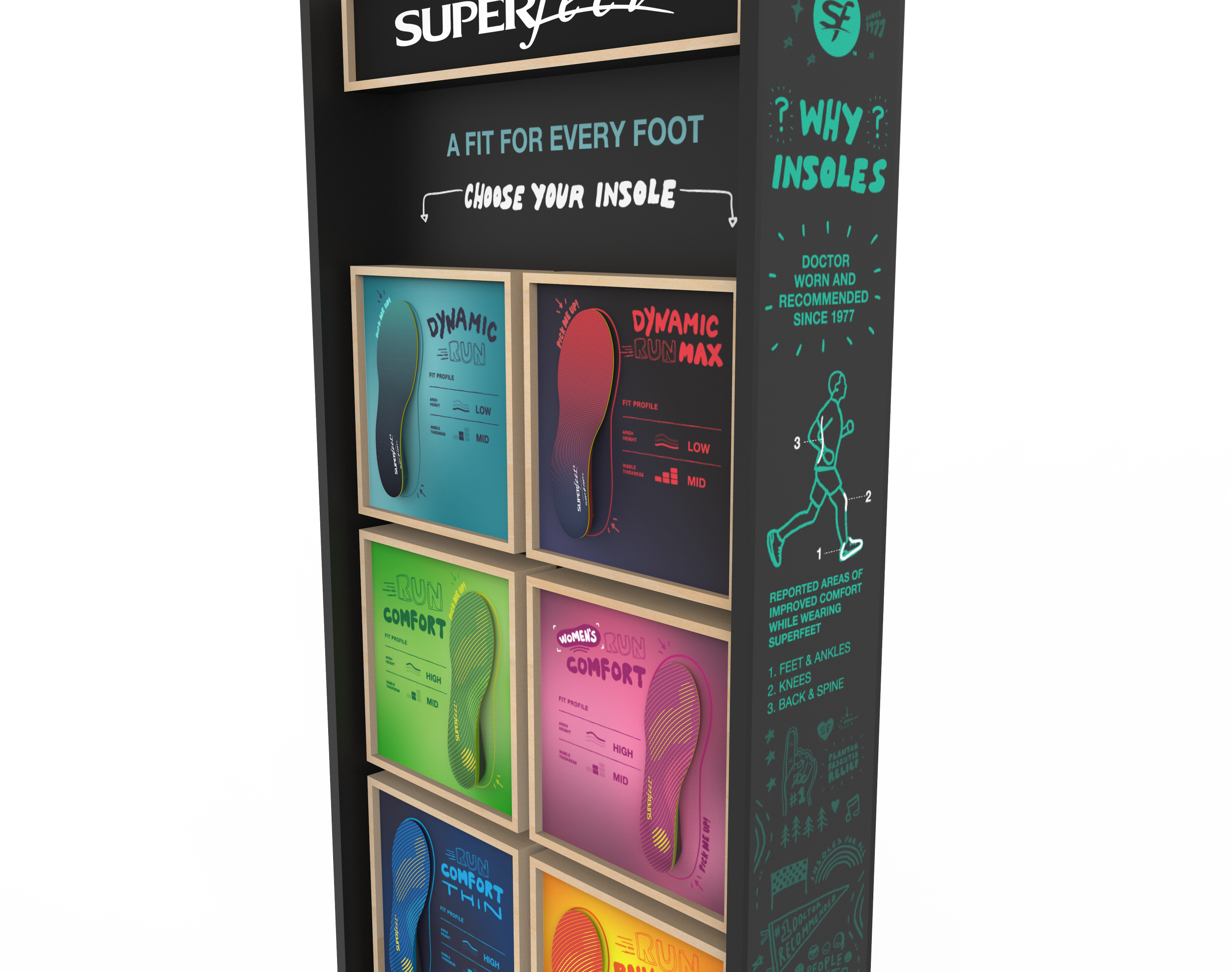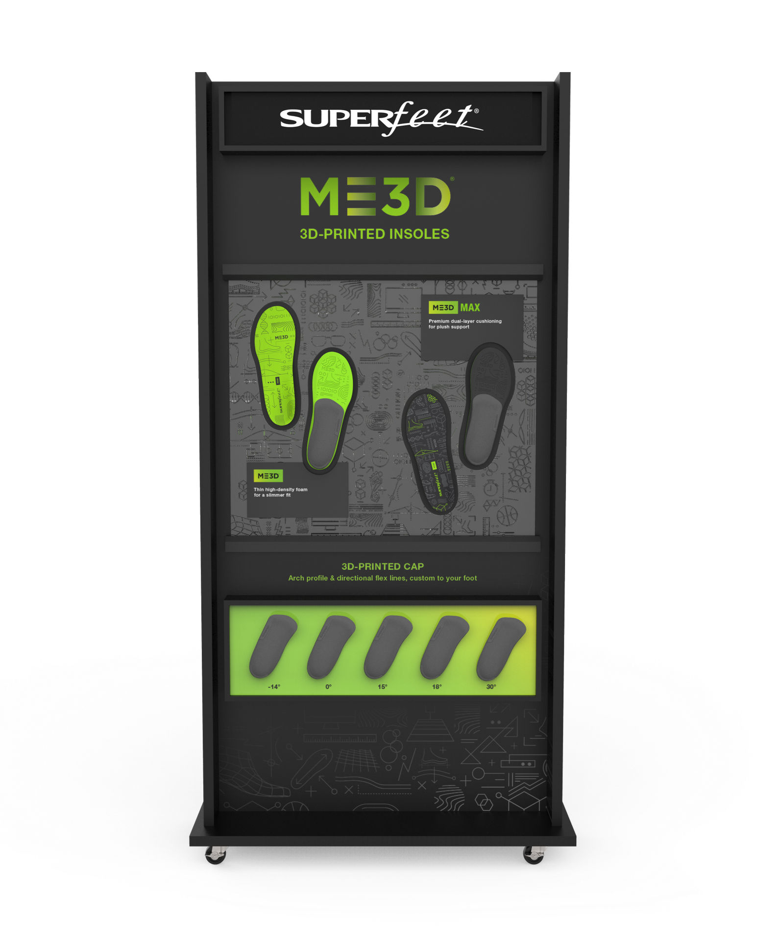 The Shape-in-Shop retail fixture brings Superfeets’ insole story to life with a clean, display of packaged products, interactive displays, and an education panel that highlights the innovation behind the ME3D printed insoles. Flexible by design, it can be configured in endless layouts to fit any retail environment.
